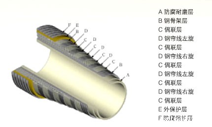 钢帘线层是起抗内部压力和轴向拉力的螺旋式钢质增强层,符合定线的标准, 所用钢丝绳有许多等级,视所需强度和工作环境而定。